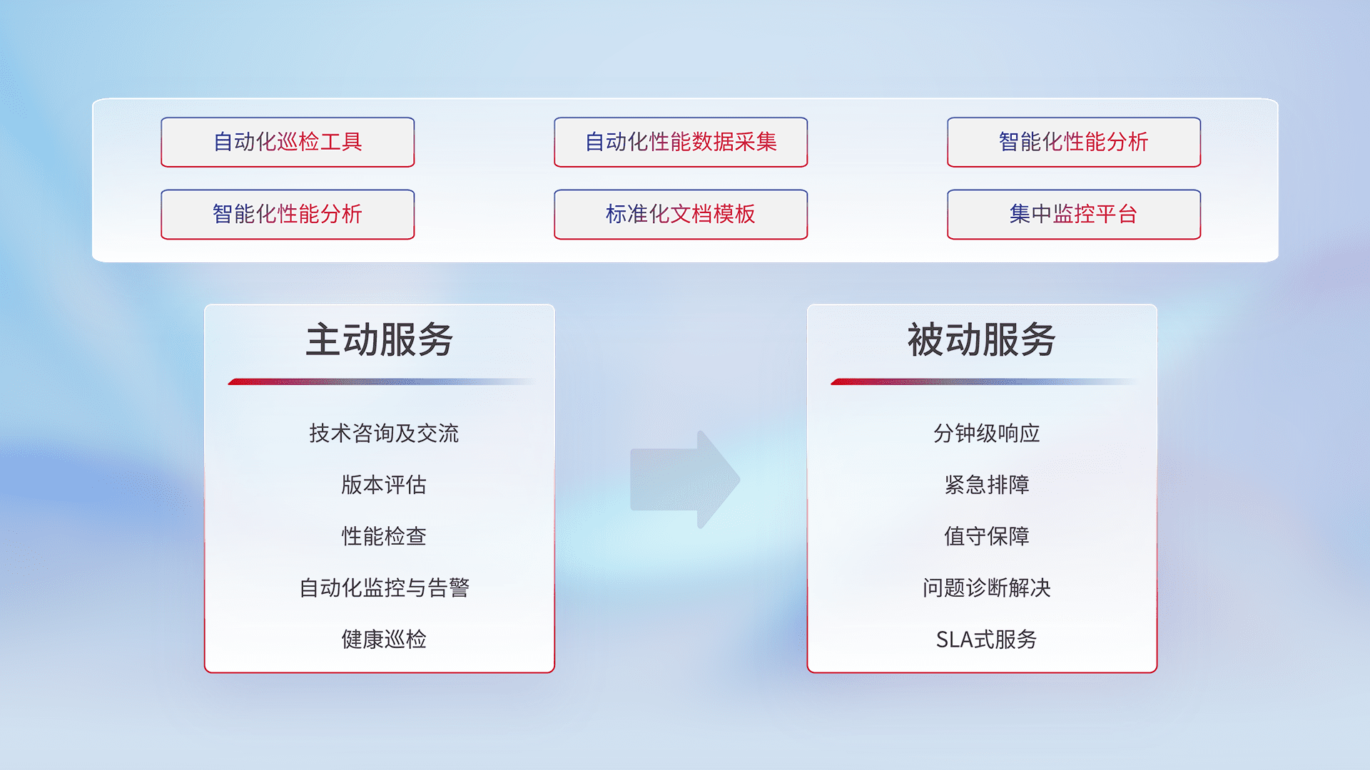 智能化工具和标准化文档,,保障服务质量,,提供主动服务(包含技术咨询、、版本评估、、、性能检查、、自动化监控与告警、、、、健康巡检)和被动服务包含(分钟级响应、、、紧急排障、、、值守保障、、问题诊断解决、、、、SLA服务)。。。。